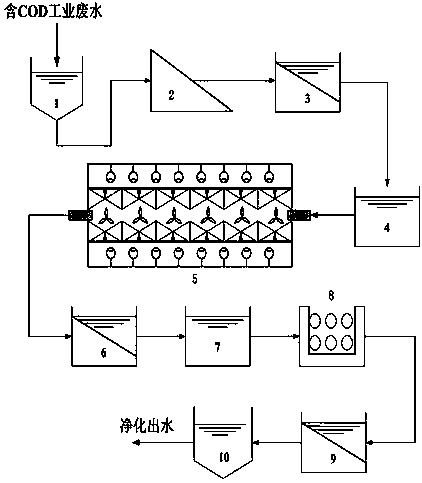 工業廢水通過廢水管線進入集水井,集水井的出口通過廢水管線連接粗格柵,粗格柵的出口通過廢水管線連接一次沉淀池,一次沉淀池的出口通過廢水管線連接pH值調節池,pH值調節池的出口通過廢水管線連接納米微孔超聲波間歇聚合反應槽,納米微孔超聲波間歇聚合反應槽的出口通過廢水管線連接二次沉淀池,二次沉淀池的出口通過廢水管線連接曝氣硝化池,曝氣硝化池的出口通過廢水管線連接生物脫氮池,生物脫氮池的出口通過廢水管線連接三次沉淀池,三次沉淀池的出口通過廢水管線連接凈水池,凈水池的出口通過廢水管線將經過本系統處理后的凈化出水外排;其中,納米微孔超聲波間歇聚合反應槽的槽體采用高強度玻璃鋼材質,其頂板和底板上各并排裝有8支超聲波發生器,槽體中部設有上、下兩道不銹鋼網狀龍骨,分別用于固定上、下兩組納米微孔表面聚合體,兩組納米微孔表面聚合體中央安裝了6支攪拌槳葉,槽體左側設有進水閥門,右側設有出水閥門;經過酸化的工業廢水通過納米微孔超聲波間歇聚合反應槽左側的進水閥門進入反應槽內部,16支超聲波發生器開始工作,發出超聲波,廢水中的有機物在超聲波協同化學效應的作用下,在納米微孔表面聚合體的表面發生C-H鍵的短暫斷裂,由于納米微孔表面聚合體材料中添加有能夠催化聚合反應進行的氯化烯丙基鈀二聚物,在其催化聚合作用下,已經斷裂的C-H鍵會迅速在納米微孔表面聚合體的納米孔隙處發生C-H鍵的再結合,從而在納米微孔表面聚合體的表面發生聚合反應,超聲波發生器開啟一定時間后即停止工作,同時兩組納米微孔表面聚合體中央的6支攪拌槳葉同時開始攪拌以產生液體湍流作用,這會使剛剛形成的有機物聚合體的分子量不斷增大,逐步匯聚成大顆粒的不溶物質并從納米微孔表面聚合體表面脫落,以懸浮物的形式分散于廢水中,并隨廢水通過反應槽右側的出水閥門排出反應槽,進入二次沉淀池,并最終通過沉淀過程從廢水中加以除去,同時,納米微孔超聲波間歇聚合反應槽中的攪拌槳葉停止工作,超聲波發生器重新開啟,并通過進水閥門重新注入廢水,開始新一輪催化聚合反應過程,如此往復循環;其中,pH值調節池的作用是將經過一次沉淀的廢水pH值調節至1.5~3.0,以滿足納米微孔超聲波間歇聚合反應槽的入水pH值要求;其中,曝氣硝化池的作用是通過好氧曝氣過程,使廢水中的各種含氮物質均轉化為硝酸鹽氮;其中,生物脫氮池的作用是通過生物活性反應過程,將廢水中的硝酸鹽氮分解轉化,從而去除硝酸鹽氮。