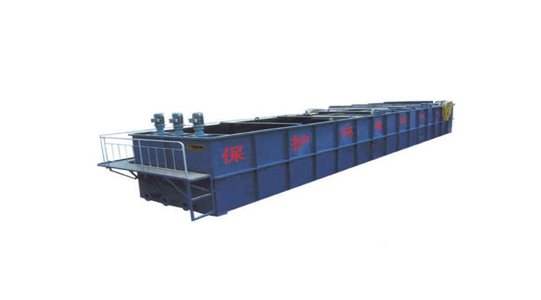 (3)未經(jīng)處理的污水首先進入曝氣充氣段,與“微氣泡”充分混合,“微氣泡”在上升的過程中,將固體懸浮物帶到水面。刮泥機沿液面運動,將懸浮物刮到傾斜的金屬板上,再將其推入污泥排放管道。污泥排放管道里有水平的螺旋推進器,將所收集的污泥送入污泥收集器,推進器和刮泥機由同一個馬達驅動。凈化后的污水在排放前會經(jīng)由斜板下方的溢流槽,溢流槽用來控制氣浮槽的水位,確保槽中的液體不會流入污泥排放管道。