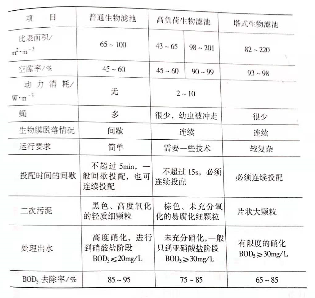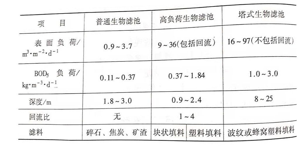 常見的生物濾池有普通生物濾池、高負荷生物濾池和塔式生物濾池等三種,下面的表格列出了這三種生物濾池的基本參數。