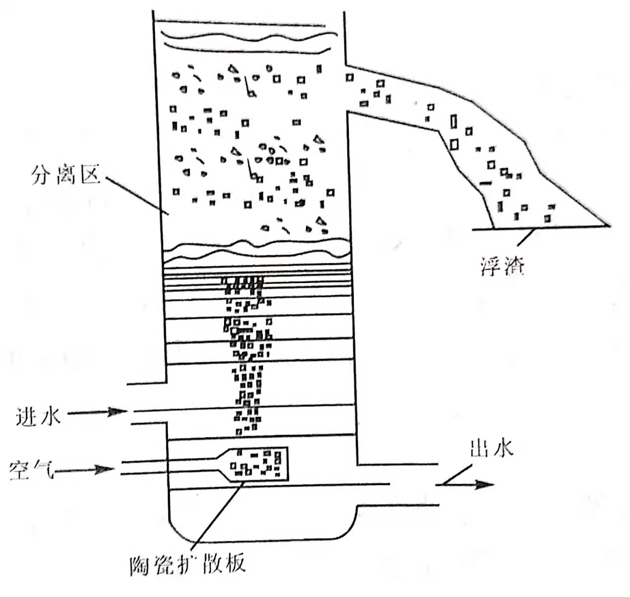 曝氣氣浮一般采用鼓風機將空氣直接送至氣浮池充氣器,形成細小氣泡進入污水中。充氣器一般用擴散板、穿孔板或微孔管等,曝氣壓力在1kg/cm2,空氣量2-3m3/m3水。擴散裝置的微孔不宜過小,否則易于堵塞;而微孔板孔徑過大,必須投加表面活性劑,方可形成可利用的微小氣泡,從而導致該種方法使用受到限制。近年研制、開發的彈性膜微孔曝氣器克服了擴散裝置微孔易堵或孔徑大等缺點。擴散板曝氣氣浮示意圖見下圖。