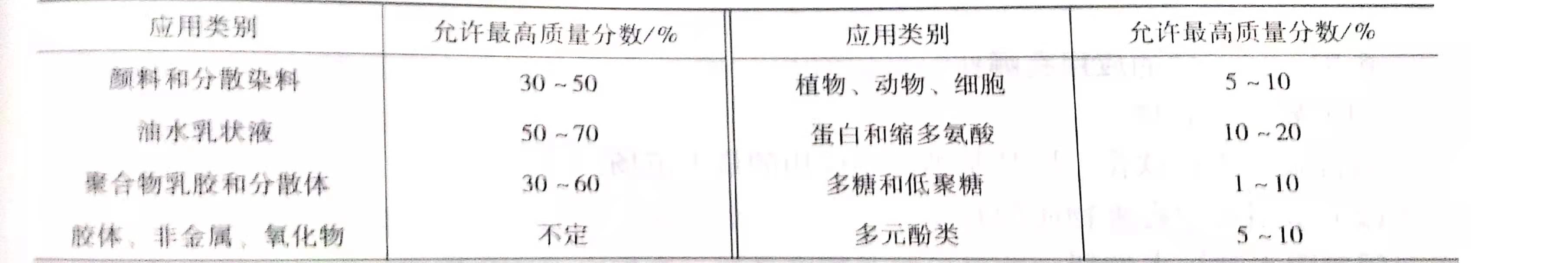 (6)隨著超濾過程的進行,料液的濃度在增高,邊界層厚度擴大,對超濾極為不利,因此對超濾過程主體液流的濃度應有一個限制,即最高允許濃度。不同料液超濾時的最高允許濃度見下表。